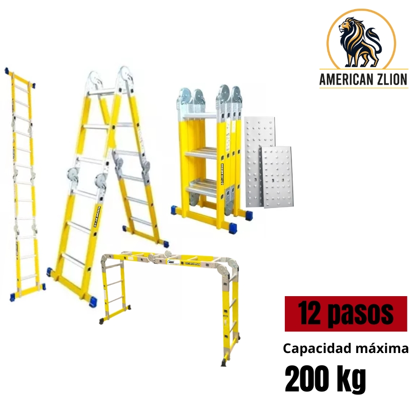 ESCALERA MULTIUSOS DE 12 PASOS / TIJERA: 1.74 MTS / ARRIMO: 3.55 MTS / ANDAMIO: 1.50×0.96 MTS – FIBRA DE VIDRIO : AMERICAN Z LION